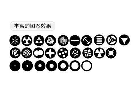 1個(gè)固定圖案盤(pán),18個(gè)圖案+白光,1個(gè)旋轉(zhuǎn)圖案盤(pán),7個(gè)自轉(zhuǎn)圖案+白光,具有變速抖動(dòng)效果、雙向變速流動(dòng)效果 ,自轉(zhuǎn)圖案片可換。圖案片外形直徑Ф22.5mm,圖案有效直徑Ф9mm