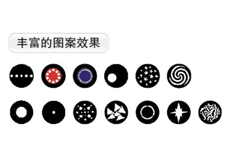 1個(gè)固定圖案盤(pán),1個(gè)旋轉(zhuǎn)圖案盤(pán);有17個(gè)可更換圖案片(可選配),圖案輪有抖動(dòng)效果及雙向旋轉(zhuǎn)效果