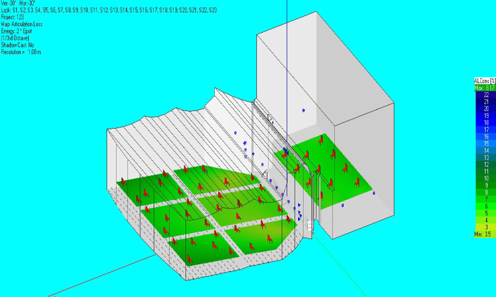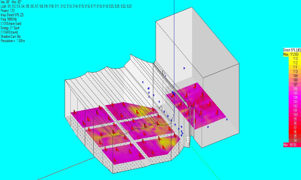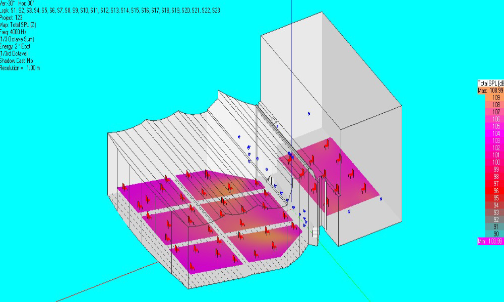 本項(xiàng)目系統(tǒng)較多,為了能把這次的改造工作做到盡可能的,我們認(rèn)真采集現(xiàn)場(chǎng)房間的數(shù)據(jù)后,利用EASE4.0軟件,對(duì)影劇院的聲場(chǎng)擴(kuò)聲進(jìn)行計(jì)算機(jī)模擬輔助設(shè)計(jì),通過音箱選型后,影劇院 的模擬設(shè)計(jì)各項(xiàng)指標(biāo)都達(dá)到了國(guó)家相關(guān)標(biāo)準(zhǔn)《GB50371-2006》劇場(chǎng)類一級(jí)標(biāo)準(zhǔn)。