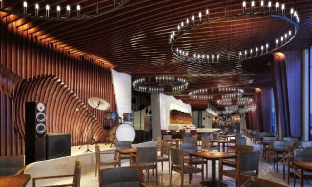 4、酒吧:滿足現(xiàn)場樂隊(duì)演出,系統(tǒng)配置德國Dynacord音 響系統(tǒng)、美國SHURE話筒、舞臺燈光系統(tǒng)。
